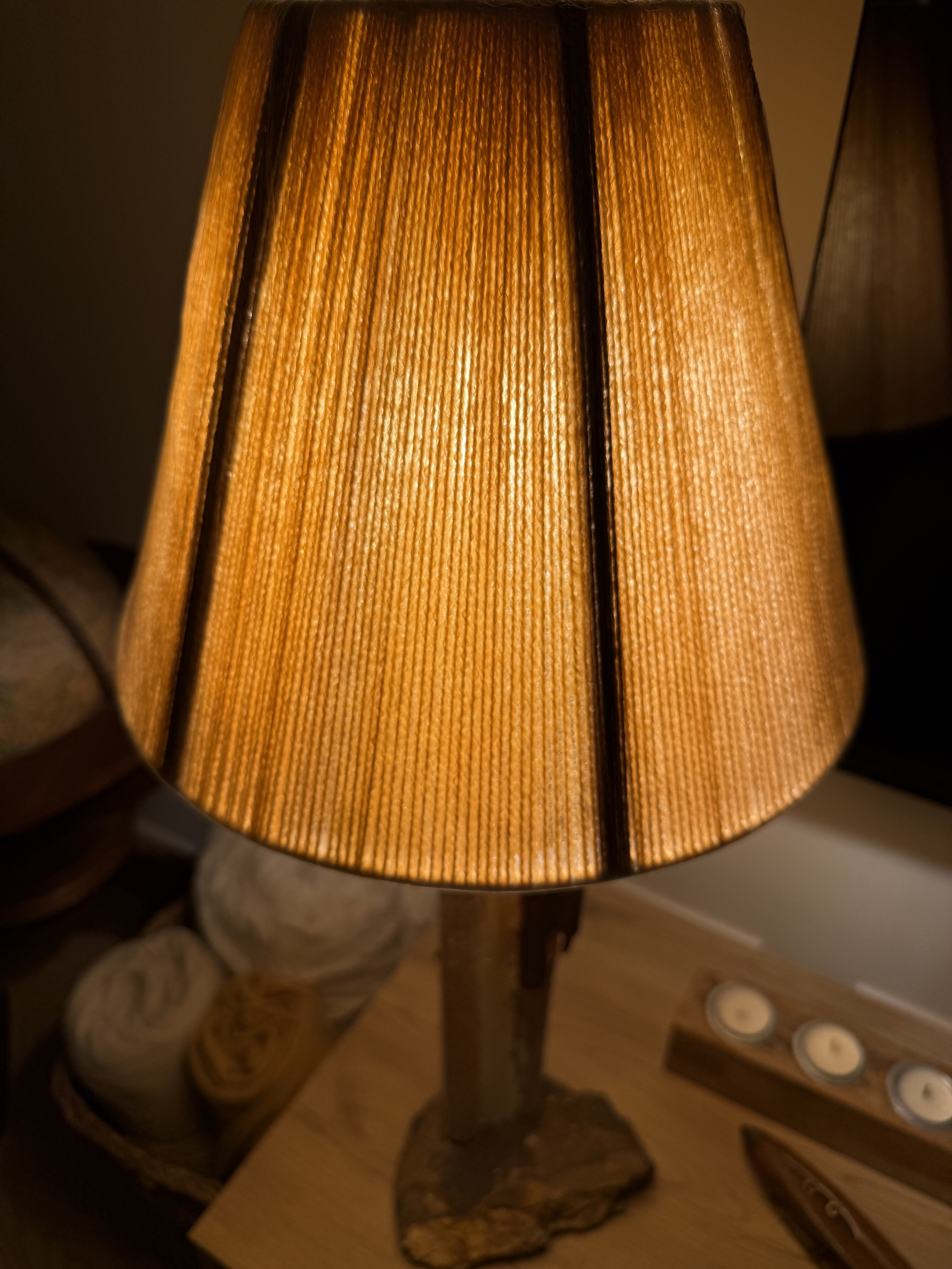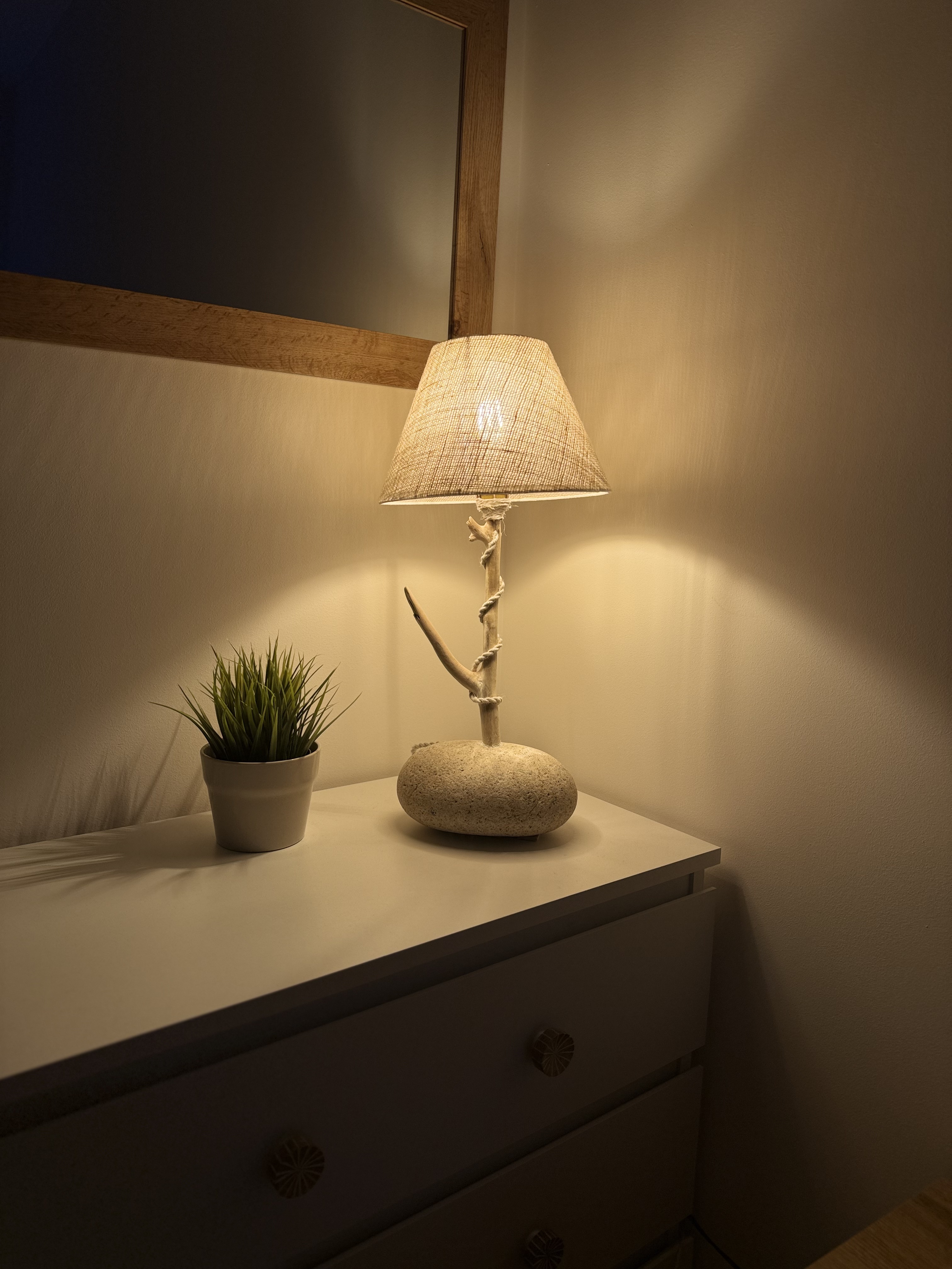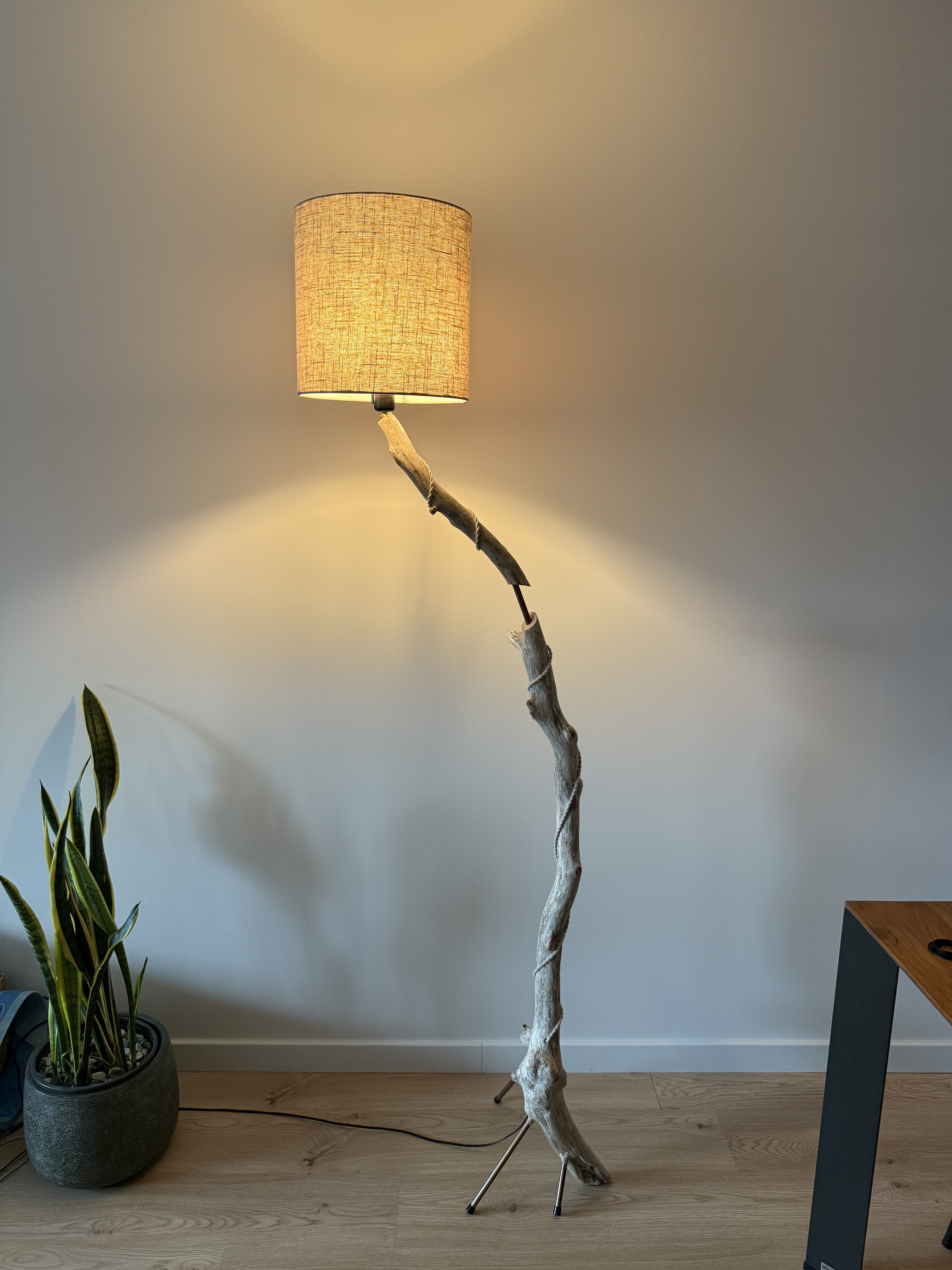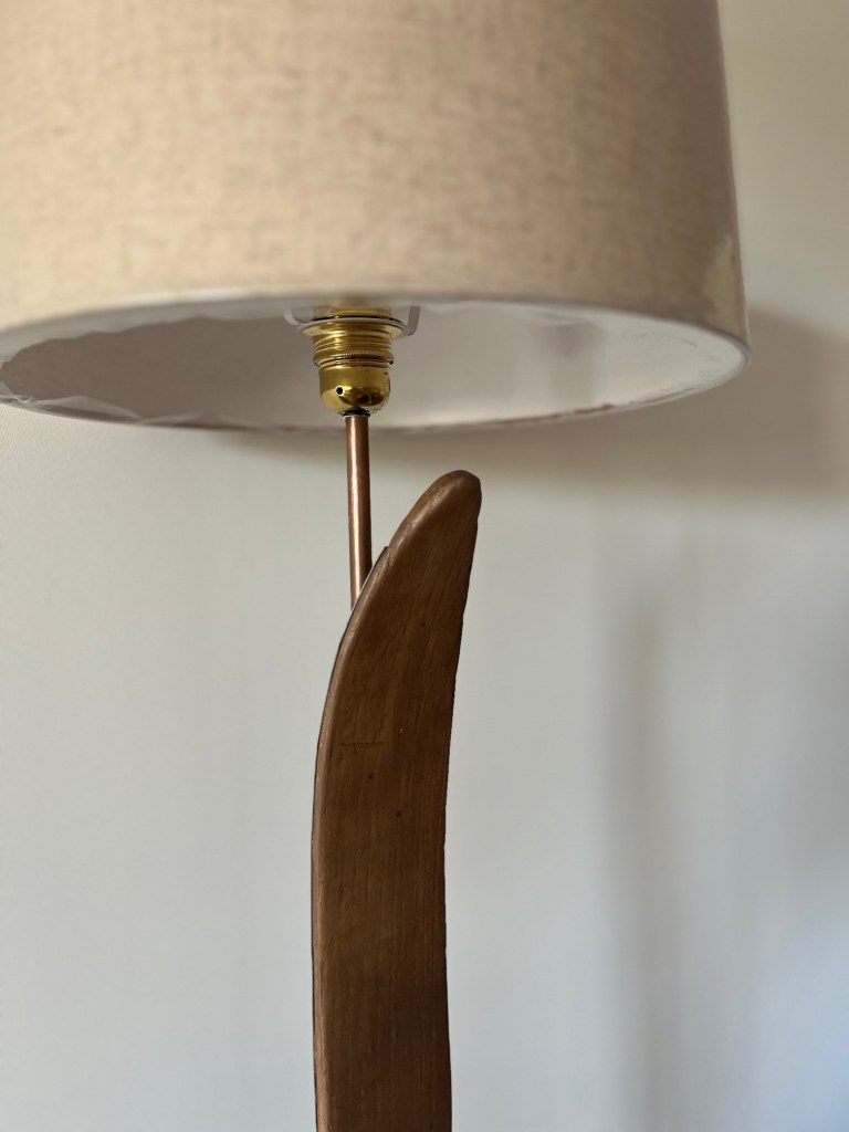 Tronco de playa, patas de cobre y pantalla de lino.