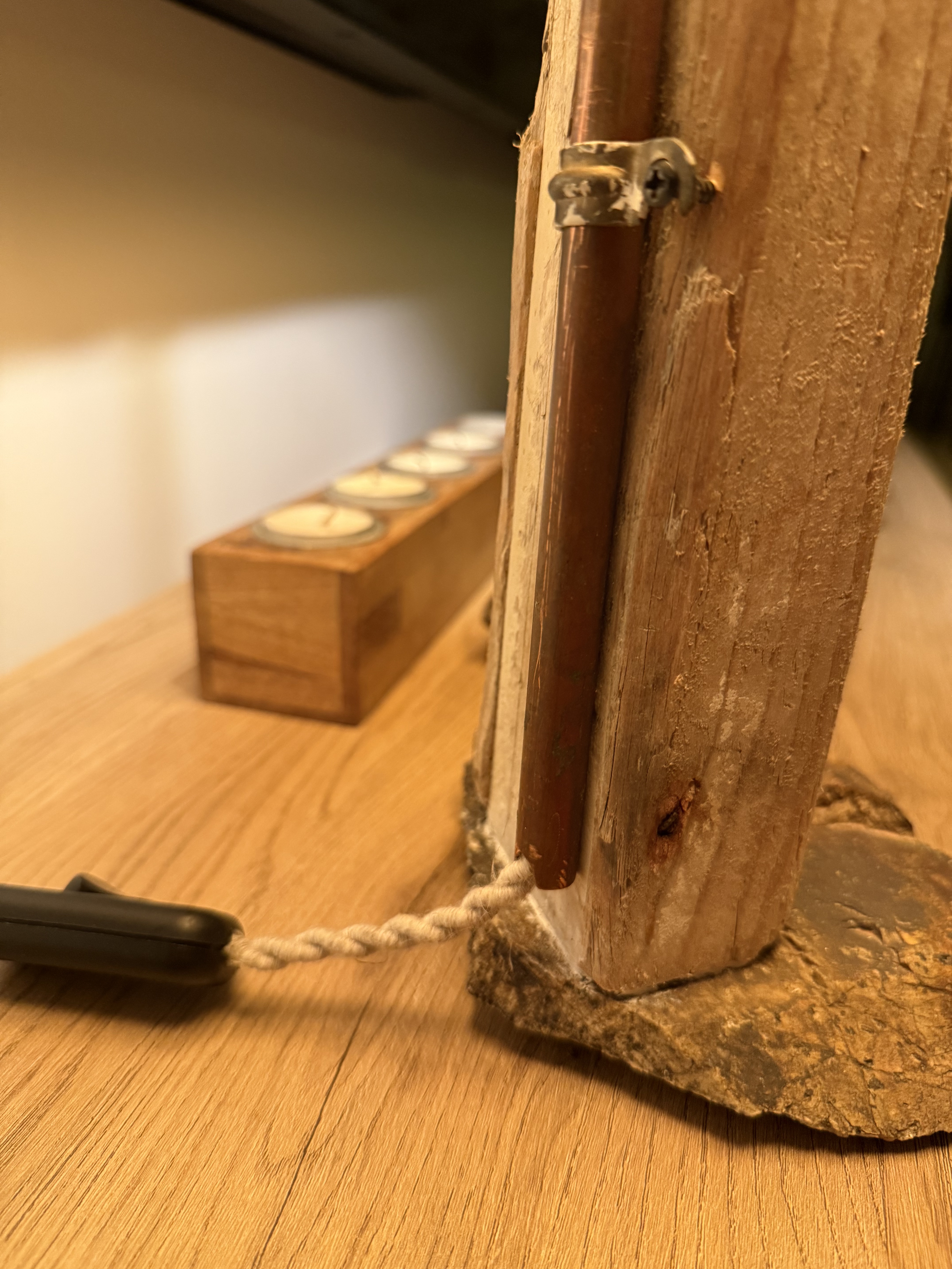 Tubo de cobre en base de acacia encolada.