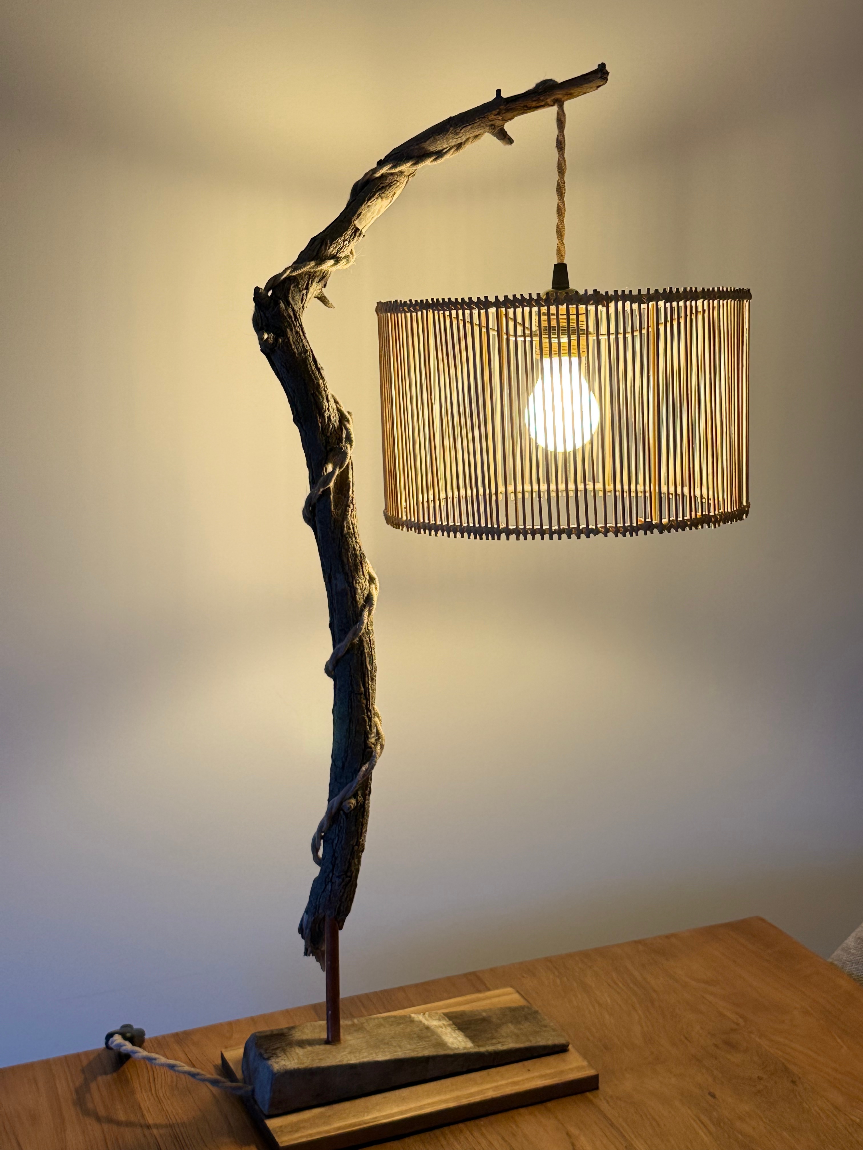 Bambú barnizado con pantalla de rafia suspendida en base negra de pino.