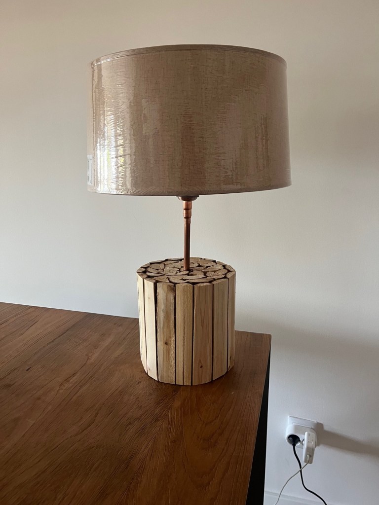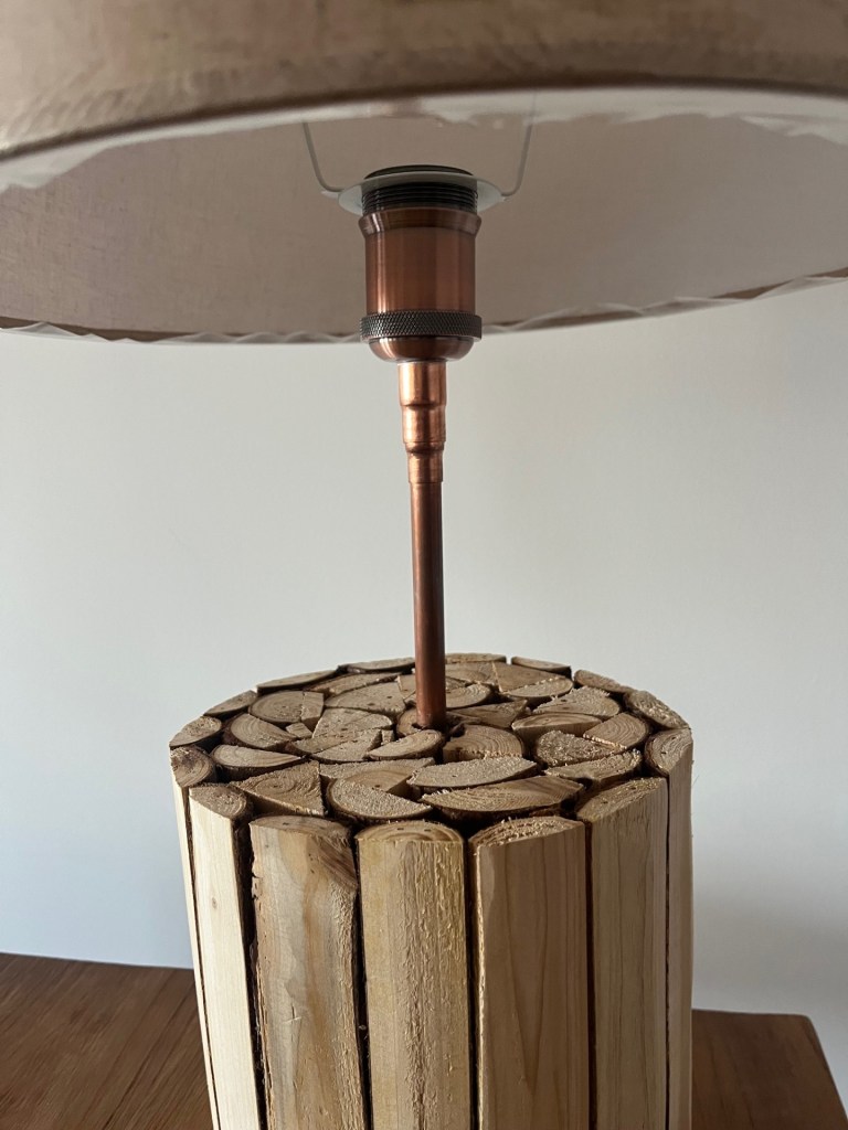 Base de pino en corteza con pantalla de lino en tubo de cobre.