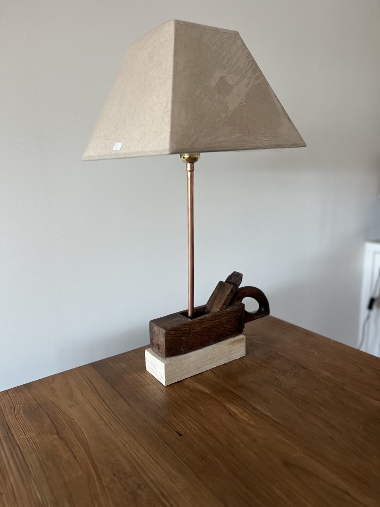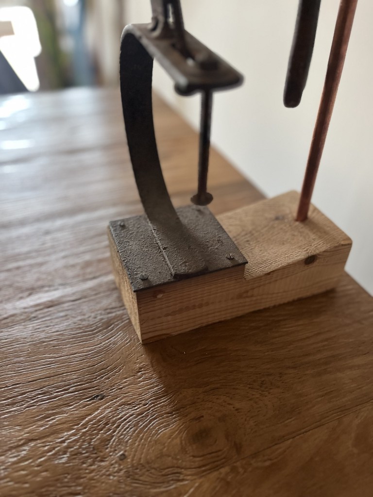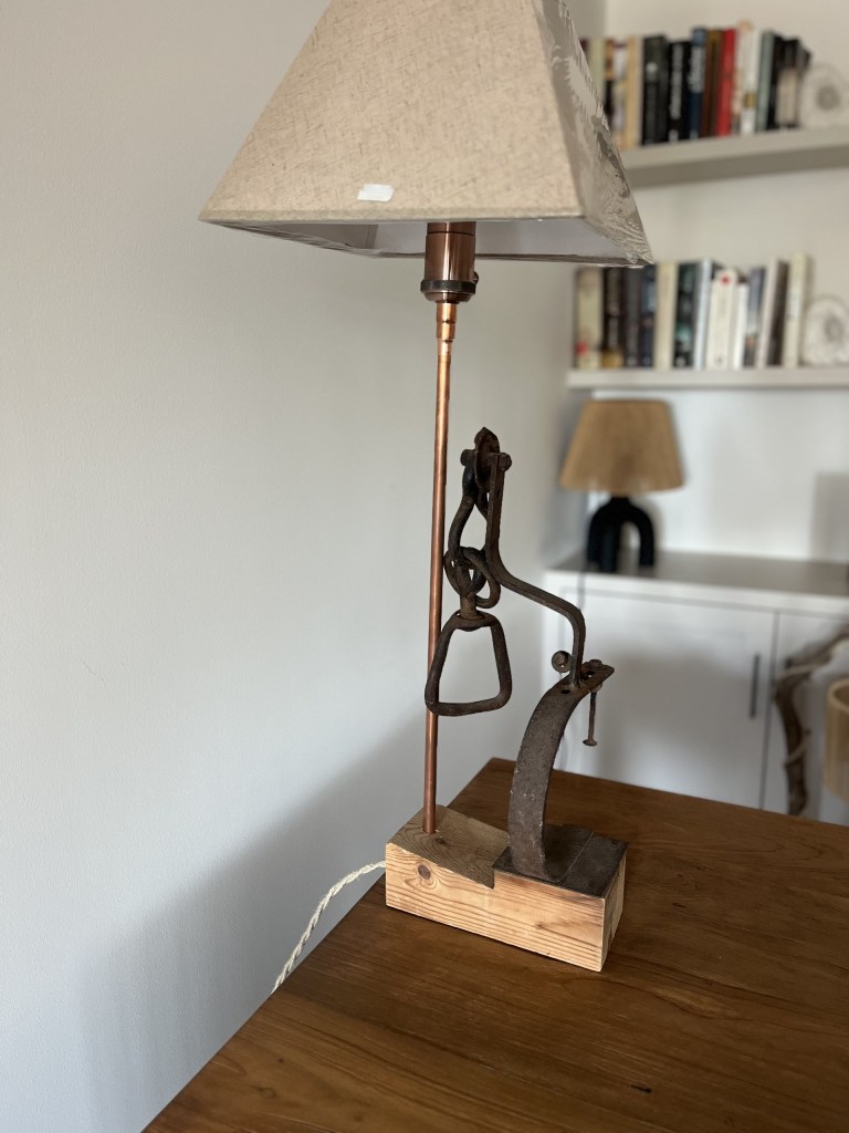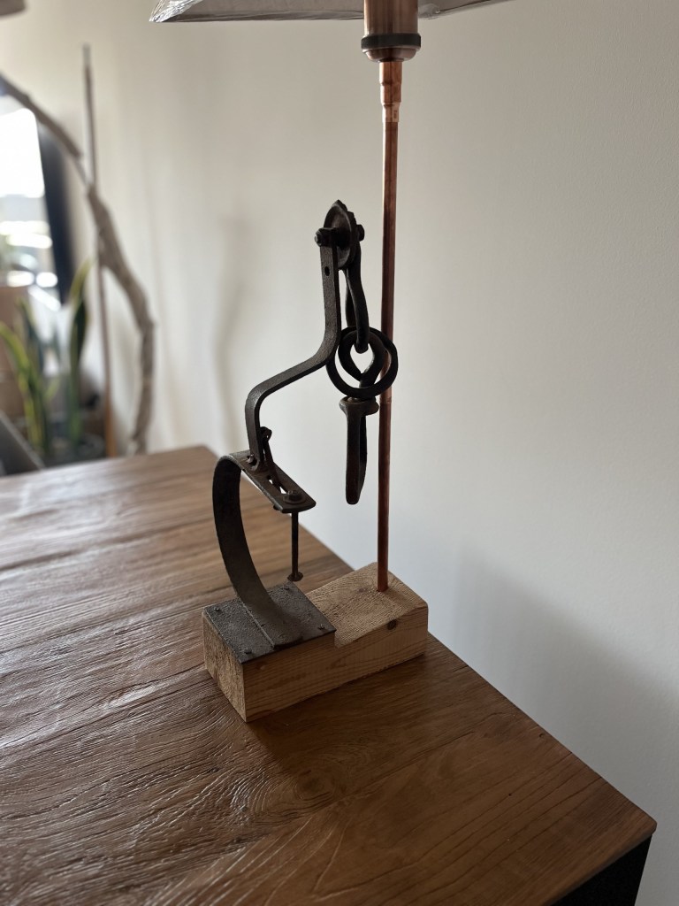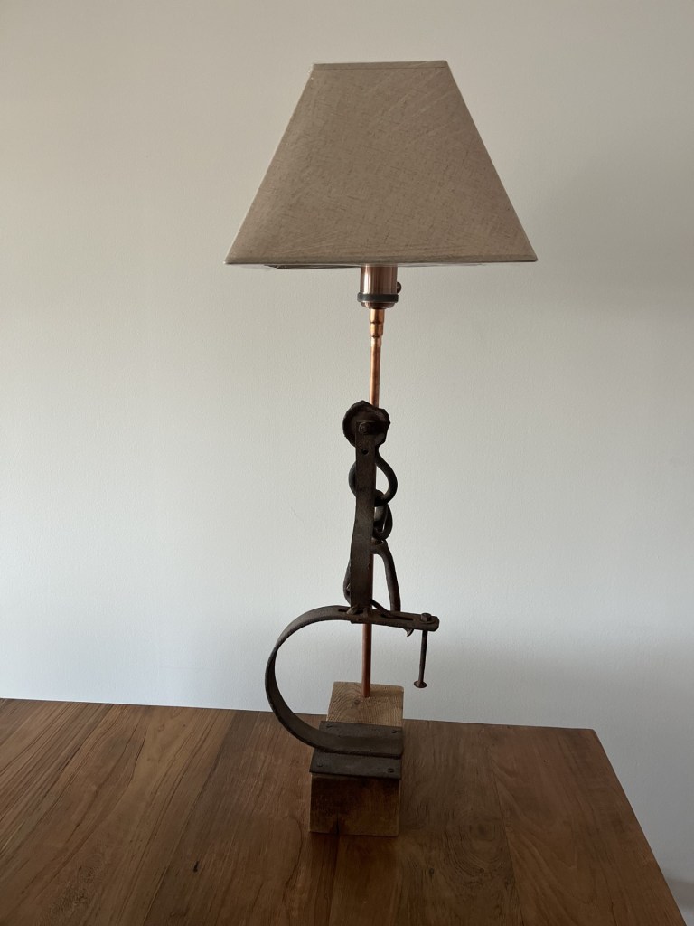 Hierros soldados con pantalla de lino en base de pino.
